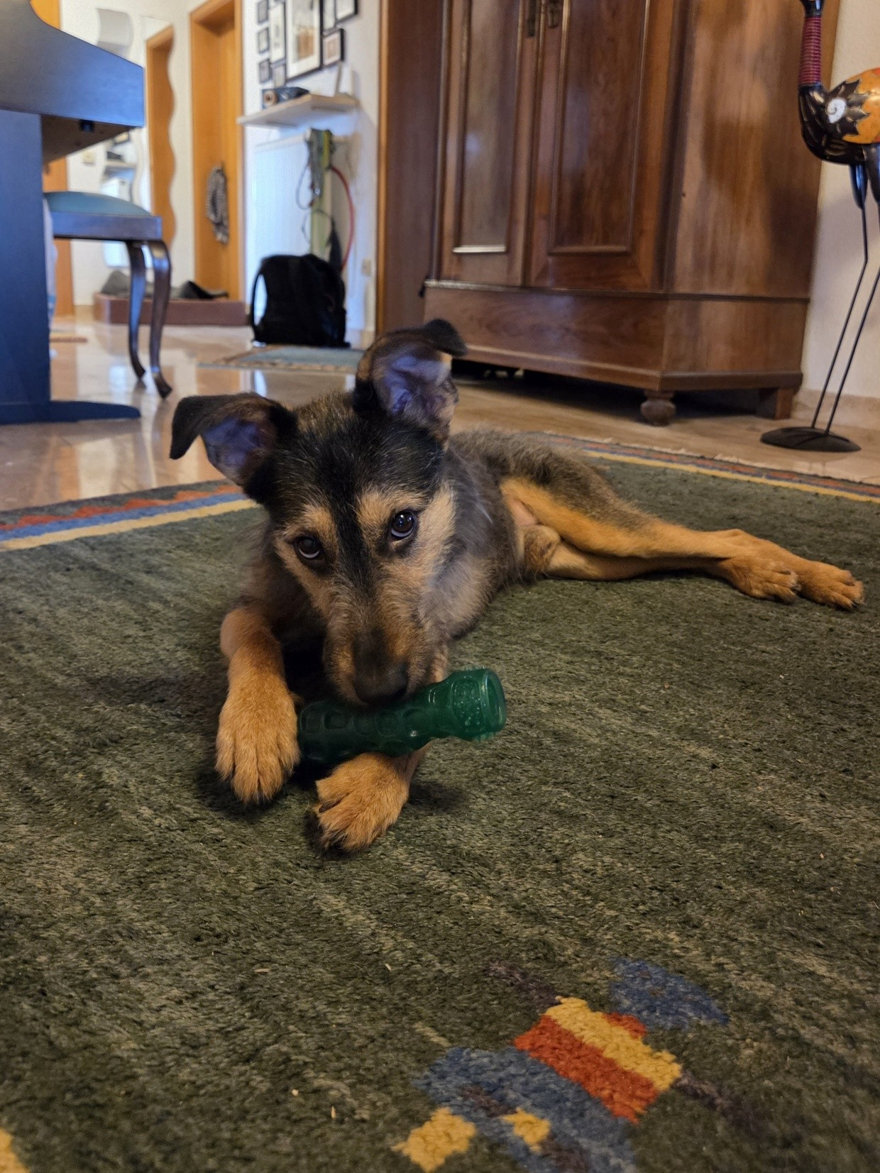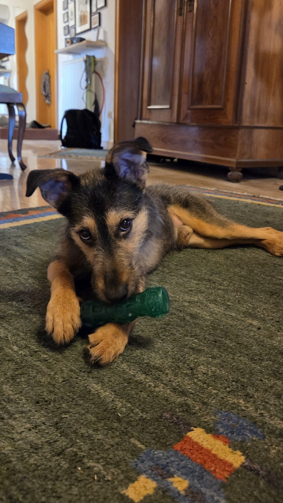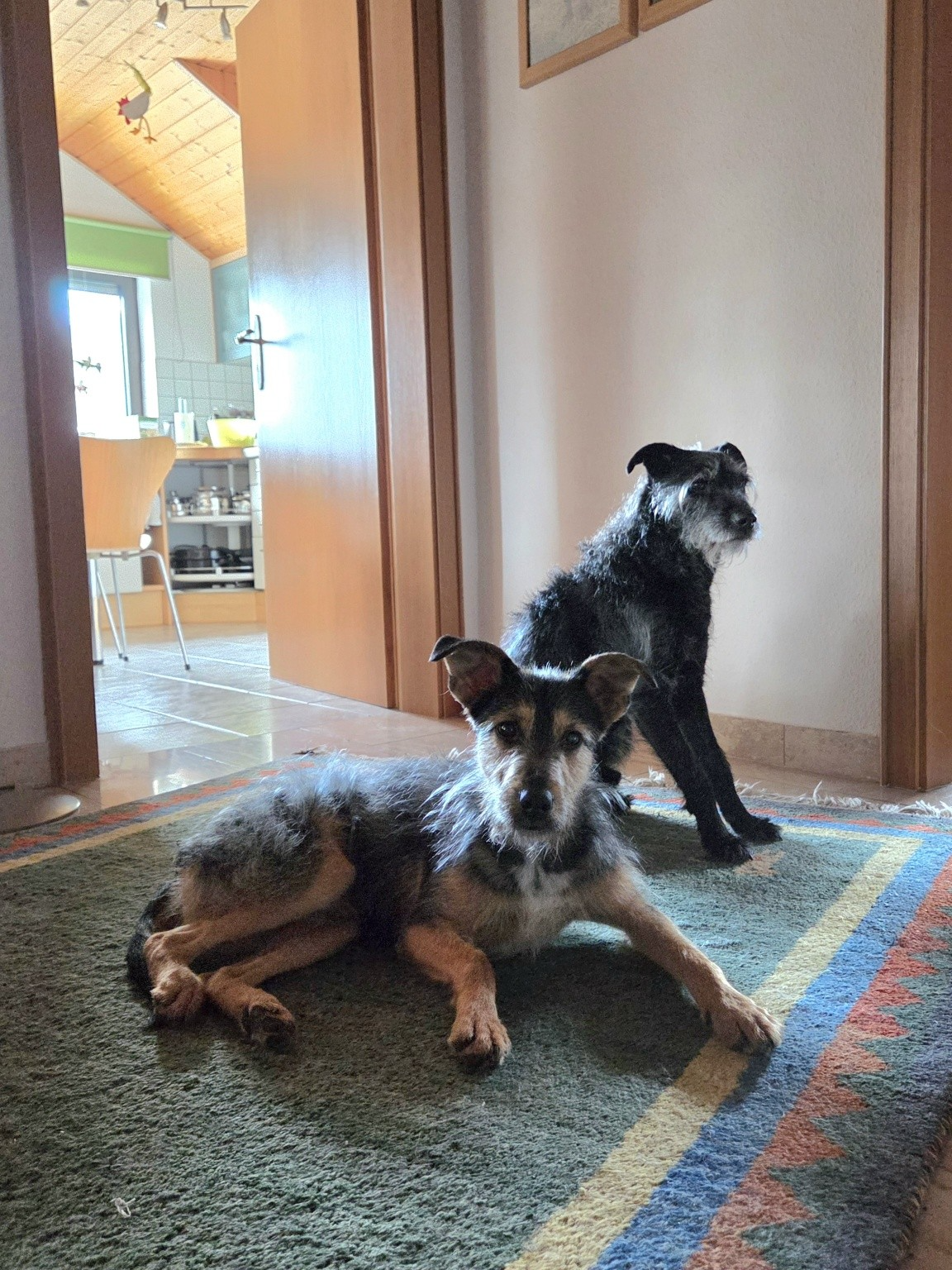 Völlig befreit ist er inzwischen ein eigenständiges Kerlchen, hat sich aus dem Schatten von Zeus gelöst uns braucht nur liebe Leute um sich rum. Ein Zweithund wäre toll zum Spielen, ist aber entgegen der ersten Einschätzung nicht zwingend notwendig.